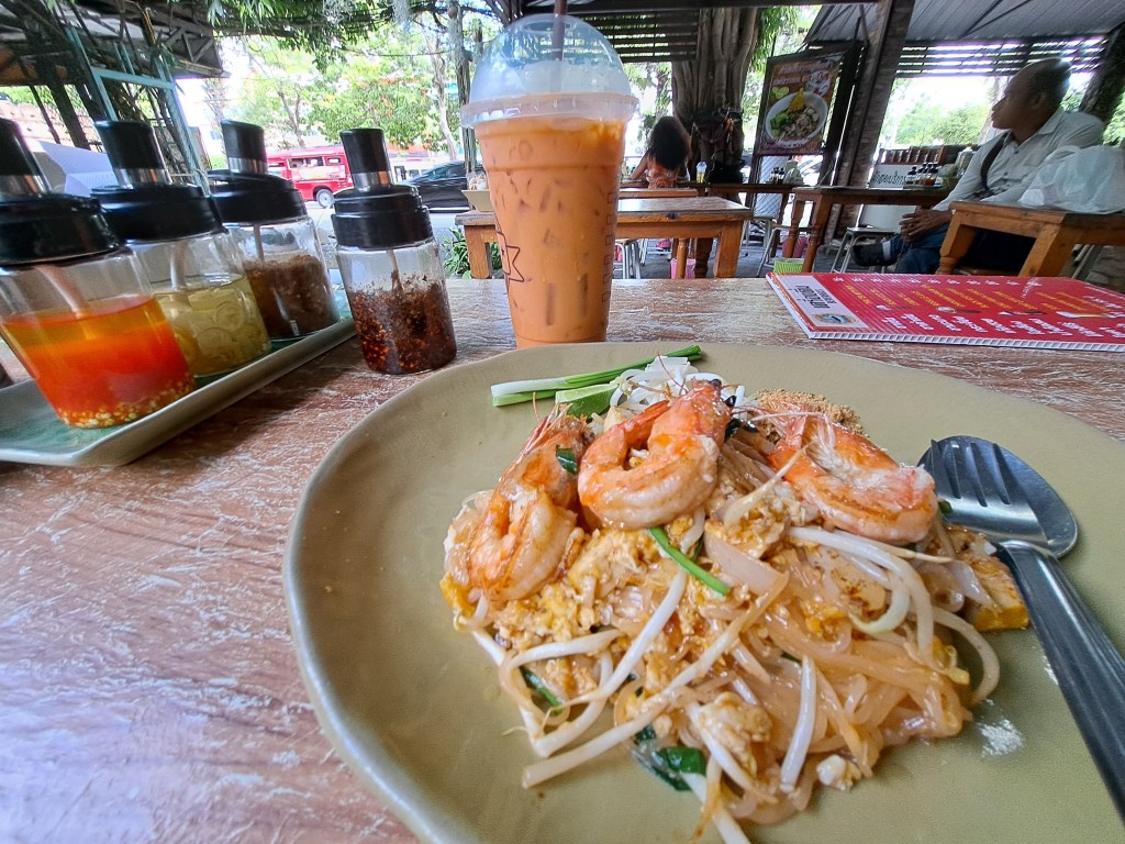 The old Thai favorite, pad thai with shrimp and iced tea in Chiang Mai, Thailand.