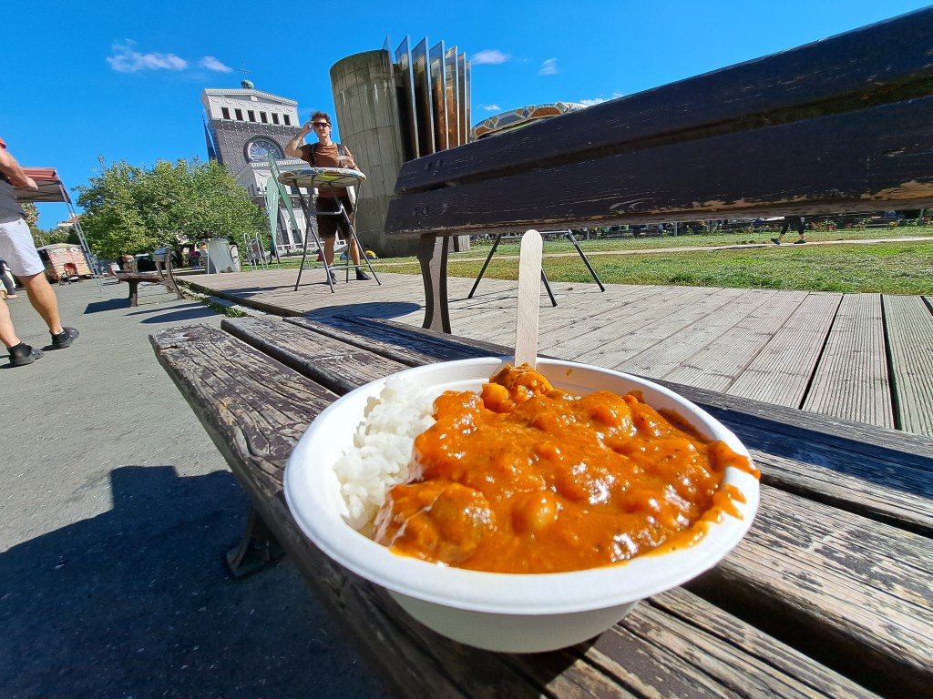 A beautiful day at a farmers’ market, vegan guláš with rice in Prague, Czechia.