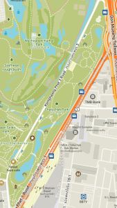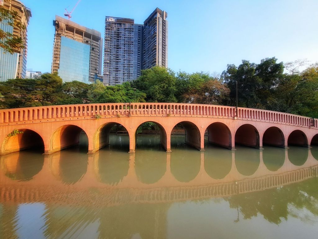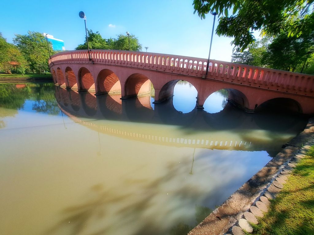 The park features a large lake with three distinctive pink bridges.