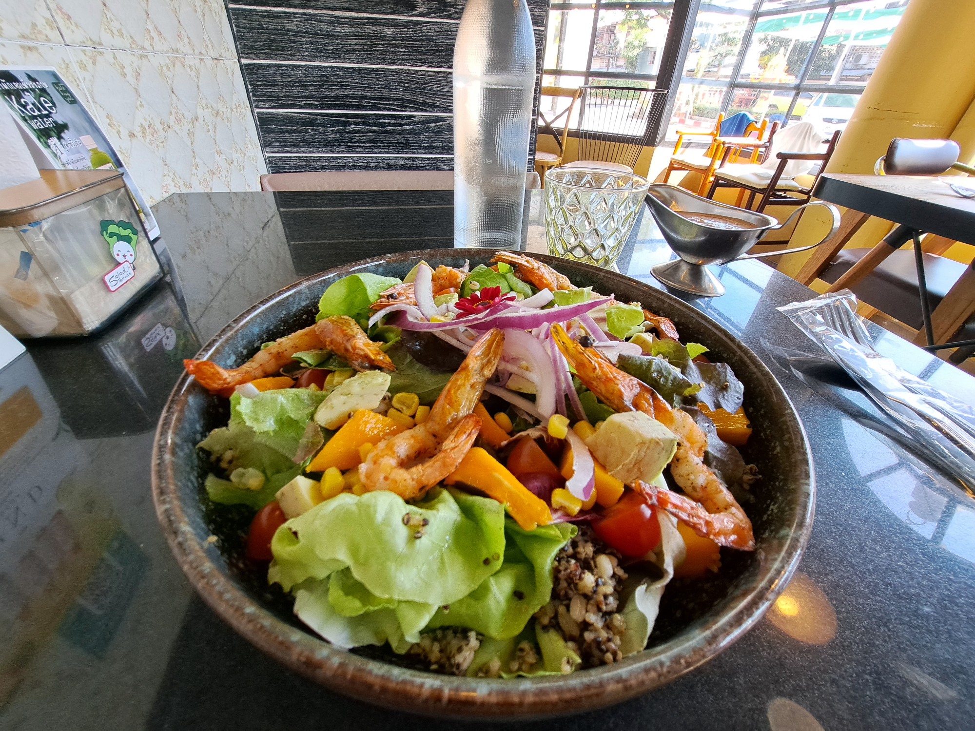 Its complete description in its name on the menu, olive oil grilled shrimp mango avocado salad with quinoa in Chiang Mai, Thailand. …