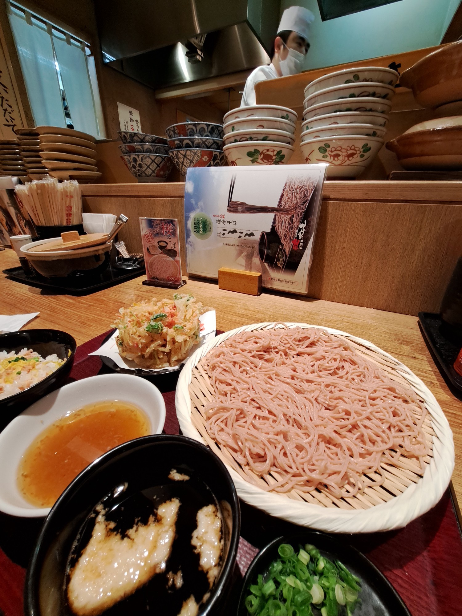 A cherry blossom season special, sakura soba set meal in Kagoshima, Japan. …