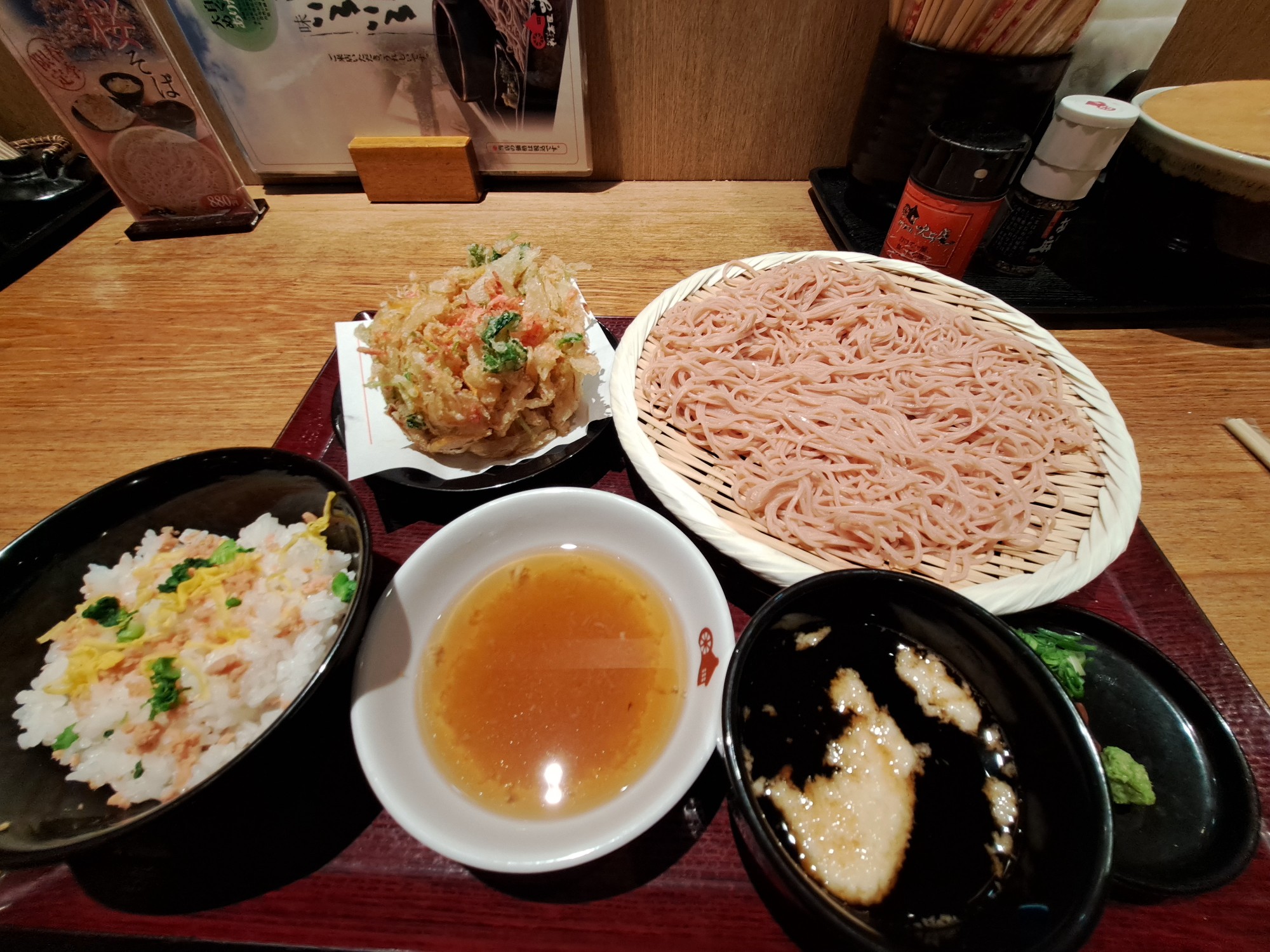 Not only pretty, but delicious, too! Includes pink soba noodles (available hot or cold, which I definitely prefer it cold), kakiage and seasoned rice, plus the dipping sauces. Nice touches by adding tiny shrimp on top of the kakiage and salmon flakes on the rice, completing the pink sakura theme!