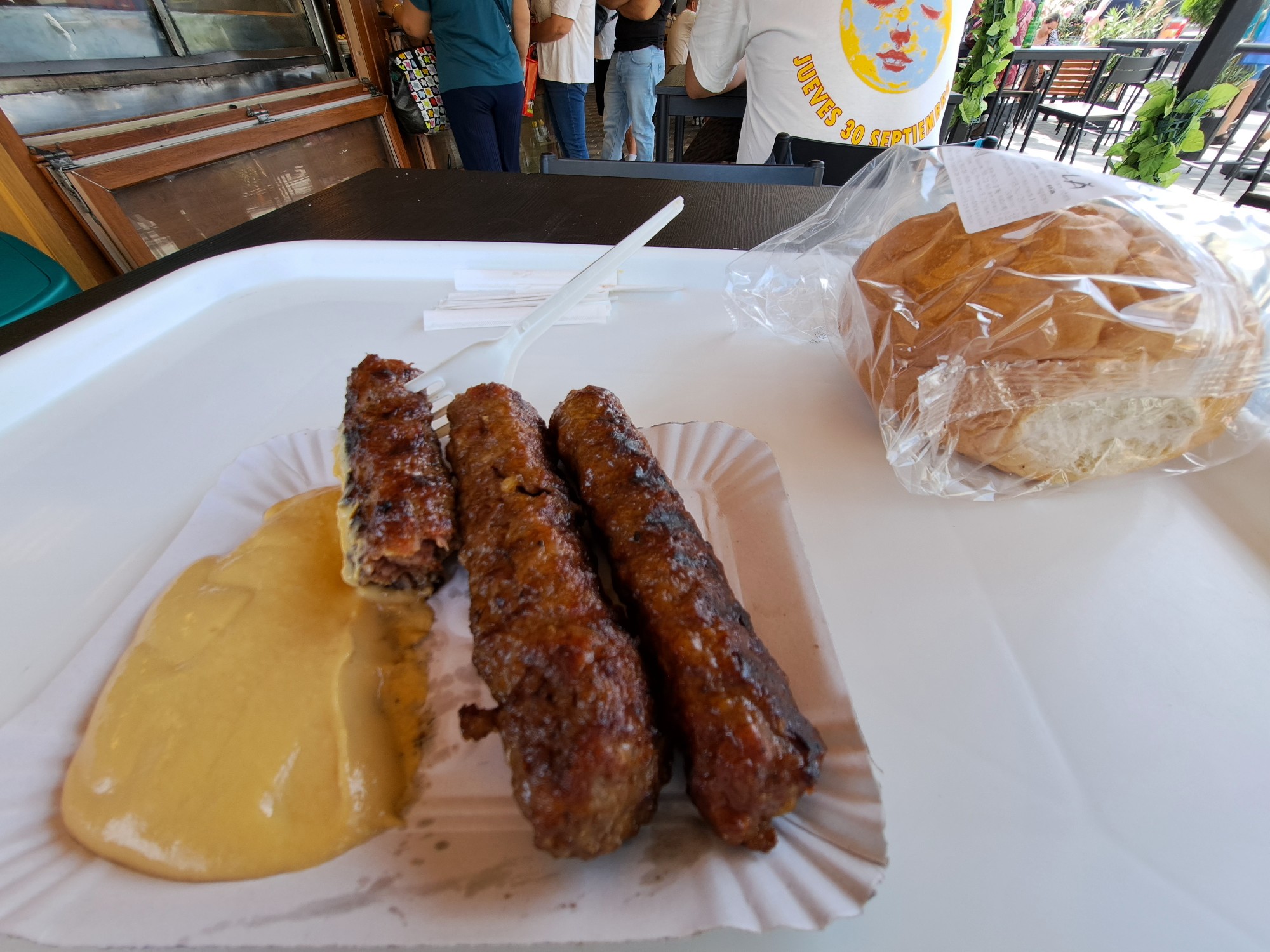 With the shape of a sausage and the texture more like a hamburger patty, but with local seasoning. Tasty and meaty, served with mustard and a bun.